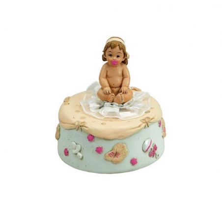 Caixa de música bebé sendo no cobertor de renda com sua chupeta. A base bege e branca é decorada com pequenos motivos de brinquedos e botinhas para bebé. Ao dar corda no movimento mecânico na parte inferior da caixa de música, o bebê gira na base e uma melodia familiar soa.