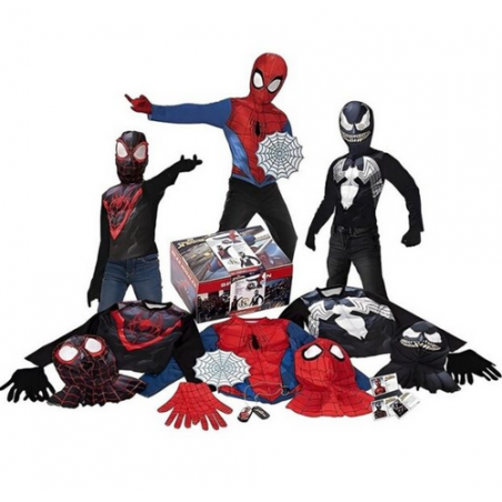 Baú do Homem-Aranha com 3 personagens: Homem-Aranha, Miles Morales e Venom, todas com peito musculado, máscara de pano e luvas. Inclui também uma medalha da personagem Homem-Aranha e cartões de identificação de cada personagem. Este traje do Homem-Aranha é 100% original da Marvel no filme do Homem-Aranha. Veste o traje oficial dos super-heróis do Homem-Aranha mais famosos da Marvel e de múltiplos universos.