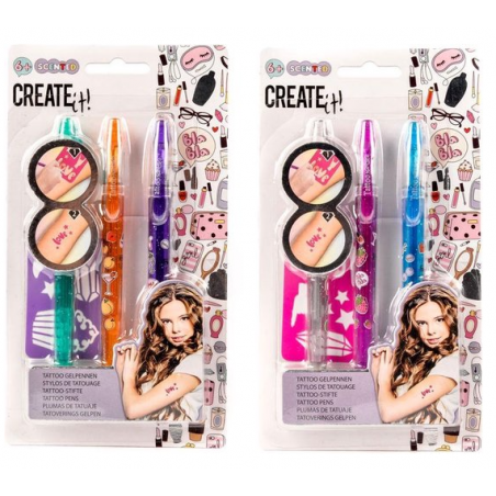 Crie-o! Conjunto de tatuagens perfumadas Com este conjunto de tatuagens você pode fazer tatuagens legais ou super bonitas. A tinta lavável funciona perfeitamente na sua pele. Com três cores divertidas e um modelo, você pode fazer tatuagens muito legais em pouco tempo!