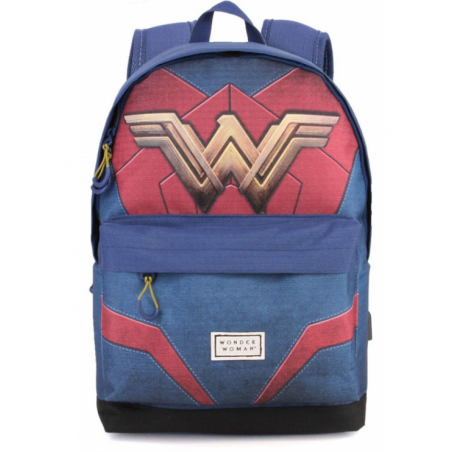 Uma mochila prática e original baseada em uma das super-heroínas mais icônicas do universo DC Comics, a grande Mulher-Maravilha.Esta mochila oficialmente licenciada com qualidade extraordinária tanto em materiais quanto em acabamentos, e é feita de lona reforçada sem o uso de peças ou componentes de origem animal. Mas, sem dúvida, o melhor é o seu design espetacular, uma homenagem ao traje da Mulher-Maravilha, com suas cores marcantes e o logotipo no peito. No interior, possui um espaço especial para um tablet ou laptop e um pequeno bolso com zíper. Também possui uma porta USB. Além disso as costas e alças são acolchoadas e ajustáveis, podendo ser adaptadas a um carrinho trolley.