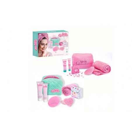 Conjunto de banho relaxante. Contém: bolsa reversível, esponjas reutilizáveis, hidratante, confete de banho, sabonete líquido, sabonete líquido corporal e uma toalha de microfibra para cabelo.
