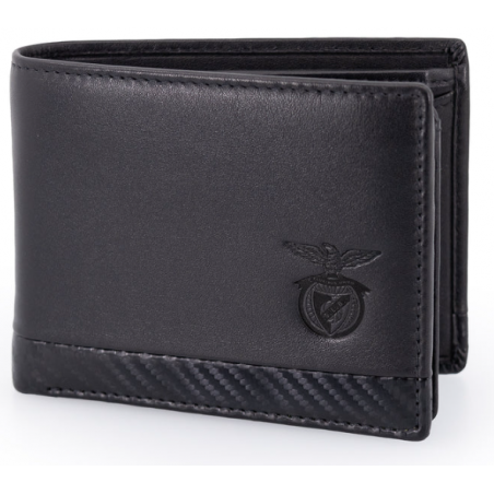 Carteira em pele genuína SL Benfica com logotipo gravado e deatalhes em textura de fibra de carbono. Ranhuras para cartões. Porta-moedas com fecho de mola. Divisória para notas. Proteção RFID.