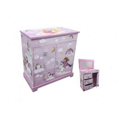Armário de jóais com 2 gavetas e porta com colar/pulseira de cabide.