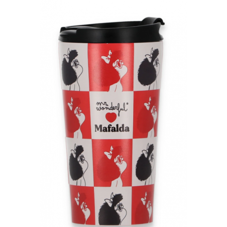 Caneca térmica para viagem com capacidade de 370 ml, Com a Mafalda como estrela, feita de aço inoxidável com parede dupla, mantém o calor e o frio durante 10 horas. Totalmente livre de BPA e hermético