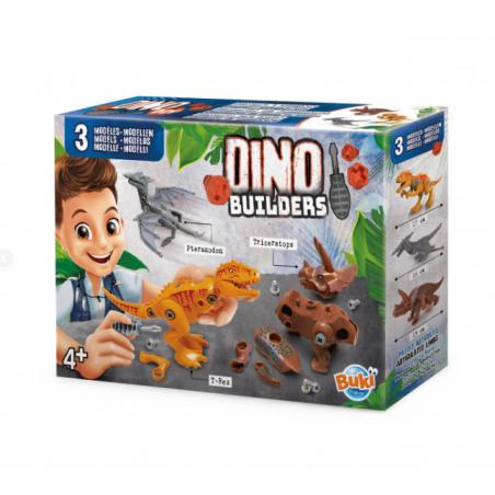 Monte os três dinossauros com a chave de fenda. Eles são totalmente articulados. Os três modelos incluídos foram: tiranossauro, tricerátopo e pteranodonte.