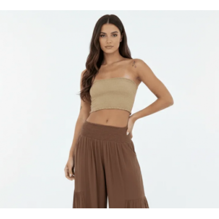 O top bustiê marfim redefine a silhueta feminina com seu design curto e minimalista, confeccionado em crepe de viscose requintado. Seu caimento fluido e etéreo garante graciosidade em cada movimento, oferecendo às clientes uma peça exclusiva que realça a figura de forma sutil e elegante.