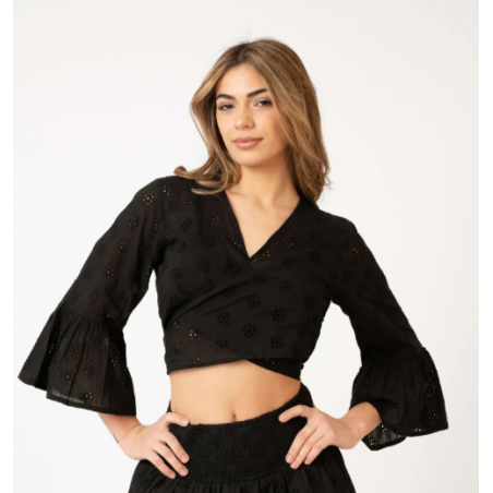 Incorpore a blusa preta Bianca na sua próxima coleção primavera/verão e veja suas clientes se apaixonarem por esta peça essencial. Perfeitamente alinhada com a sempre popular estética boho-chic, ela oferece uma evolução sofisticada para o guarda-roupa casual, elevando instantaneamente qualquer look da sua boutique. Confeccionada em puro algodão com uma estampa Schiffly requintada, esta blusa