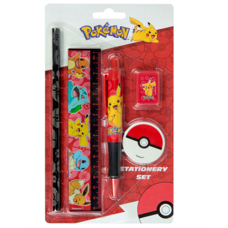 Este conjunto de artigos de papelaria de cinco peças inclui um lápis, uma régua, uma caneta, uma borracha e um apontador, todos com personagens Pokémon conhecidos. Feito de plástico e madeira, é adequado para crianças a partir de 3 anos de idade.