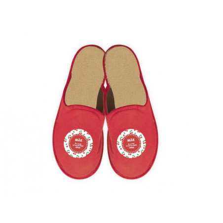 Chinelos de quarto em tons de vermelho e branco, com frase de dedicatória à Mãe.
